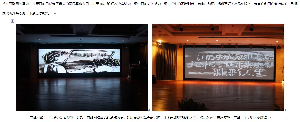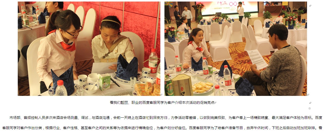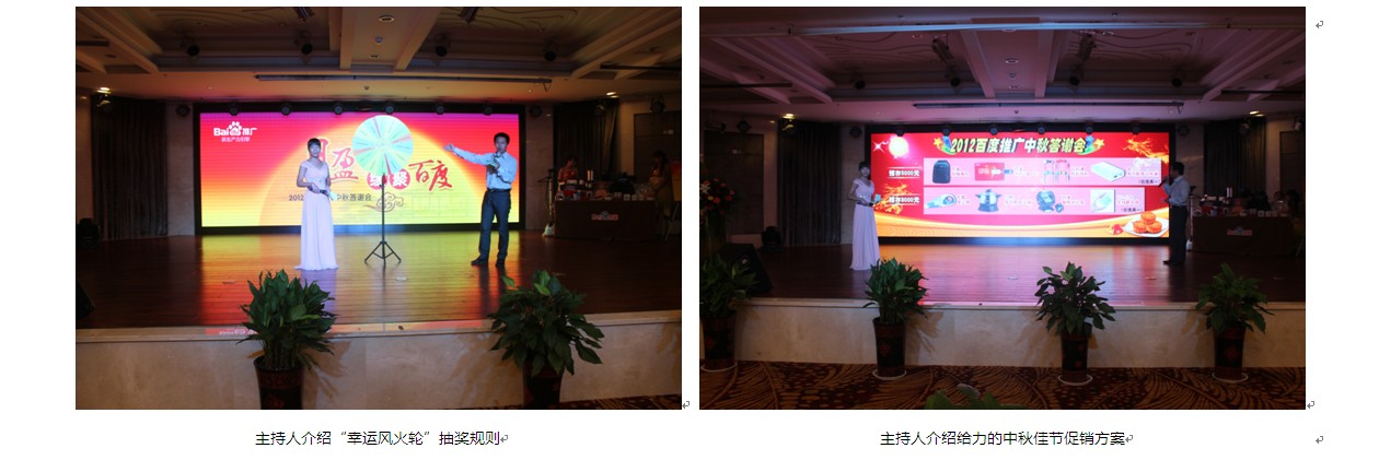 本次活動,舞臺背景使用大屏幕LED,效果絢麗多彩??蛻糇郎暇臄[放了啤酒、飲料、礦泉水、月餅、小點心、酸奶等飲食,還用心準備了餐巾紙。會務人員安排井然有序,游戲環(huán)節(jié)新穎勁爆,促銷政策激動人心,續(xù)費抽獎火熱爆棚、熱烈的客戶互動、真誠的客戶感言。無論是酒店檔次,舞臺效果還是節(jié)目的精彩程度都讓在場的客戶朋友們充分感受到了新鄉(xiāng)百度人的熱情和真誠。
