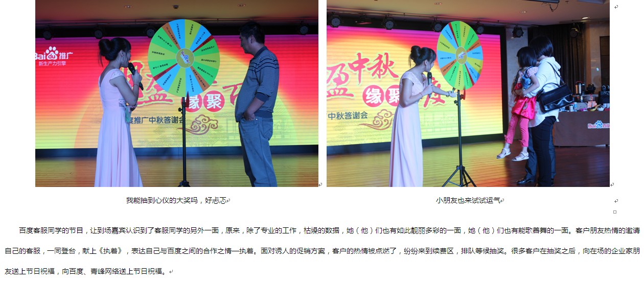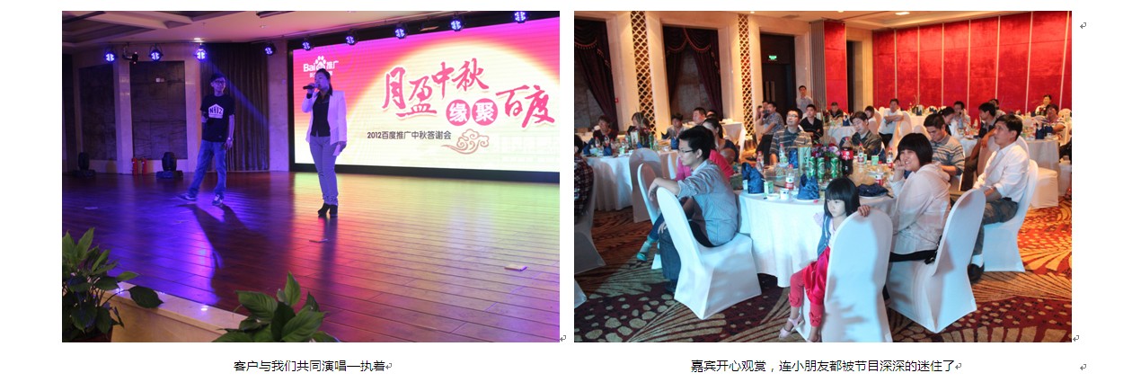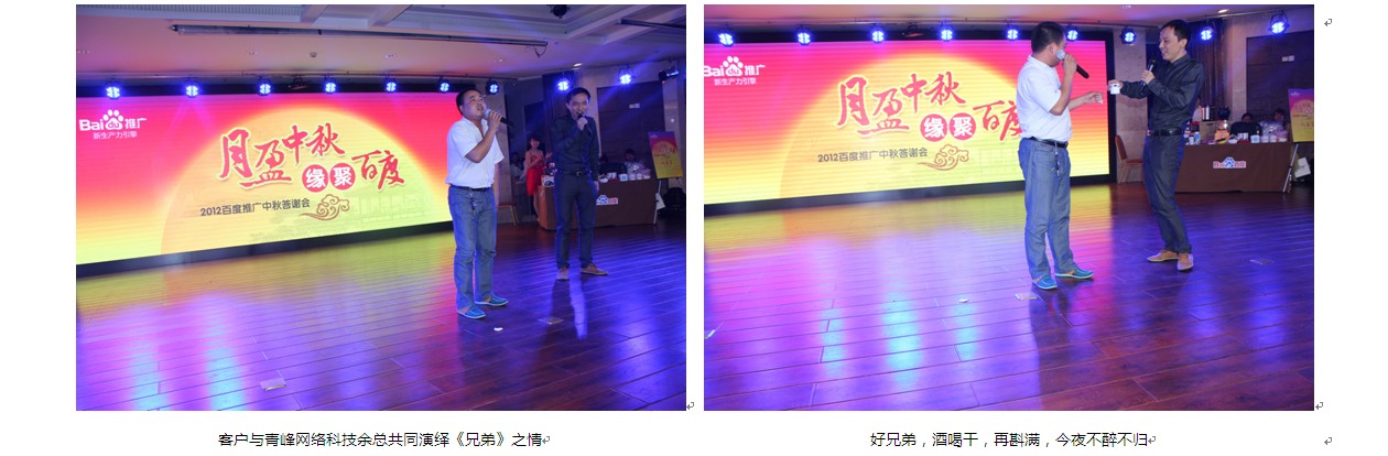 在這個秋月朗照,丹桂飄香的夜晚,我們匯聚四面八方的歡歌笑語,舉辦了一場完美的感恩盛宴。活動現(xiàn)場,新鄉(xiāng)企業(yè)家朋友按捺不住他們與百度合作的熱情,紛紛與自己的百度客服人員分享百度推廣的心得體會,甚至與我們的百度客服同事聯(lián)袂登臺獻歌,表達自己的感激之情。一曲《執(zhí)著》,一曲《兄弟》,表達了對百度推廣的“執(zhí)著之心”,與百度推廣的“兄弟之情”。