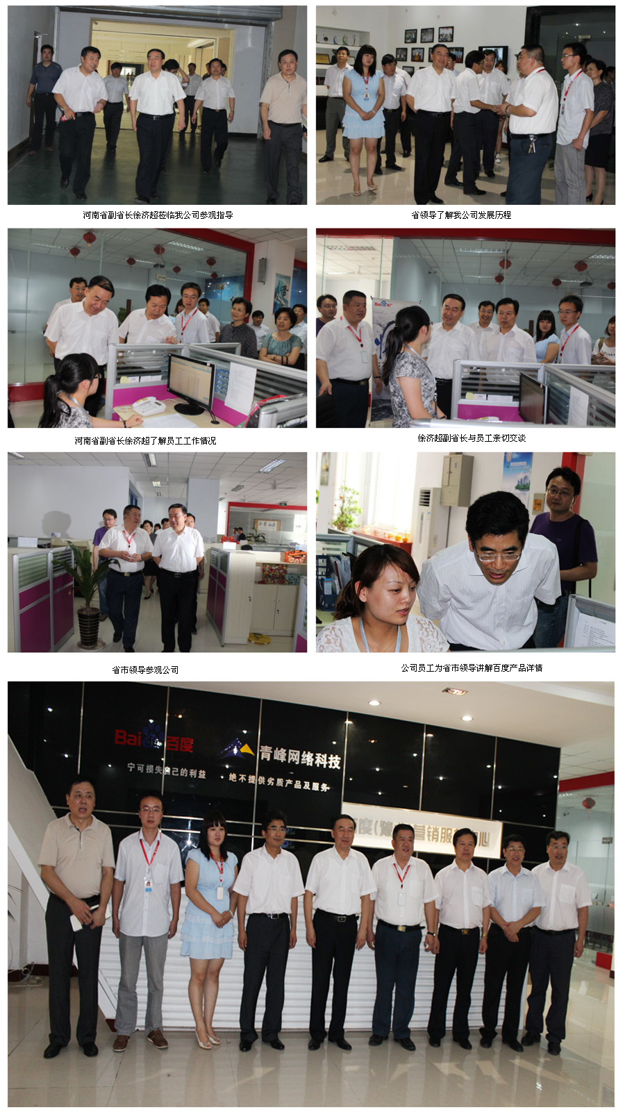 2012年7月12日,在新鄉(xiāng)市市委書(shū)記李慶貴、市長(zhǎng)王戰(zhàn)營(yíng)、高新區(qū)管委會(huì)主任王兵法、書(shū)記劉慶貴等相關(guān)領(lǐng)導(dǎo)的陪同下,河南省副省長(zhǎng)徐濟(jì)超帶隊(duì)的省企業(yè)參觀(guān)團(tuán)一行,蒞臨新鄉(xiāng)市青峰網(wǎng)絡(luò)科技有限公司參觀(guān)指導(dǎo),徐濟(jì)超副省長(zhǎng)詳細(xì)詢(xún)問(wèn)了我公司發(fā)展歷程,企業(yè)規(guī)模等情況,與公司員工親切交談,并提出省市各級(jí)政府今后工作中將“突出企業(yè),企業(yè)為先”幫助企業(yè)不斷發(fā)展,對(duì)青峰網(wǎng)絡(luò)科技有限公司的發(fā)展、進(jìn)步表示贊許與鼓勵(lì)。